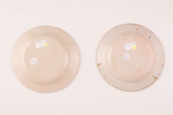 Coppia di piatti a fondo bianco con decoro vegetale blu a spugnetta