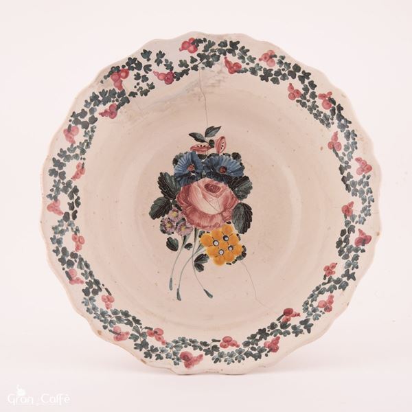 Grande piatto in maiolica decorato sulla tesa con ghirlanda e sul cavo con un mazzetto floreale