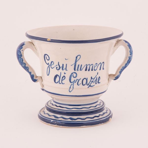 Coppa biansata in maiolica decorata con l'iscrizione: "Gesù lumen de' Grazie ".