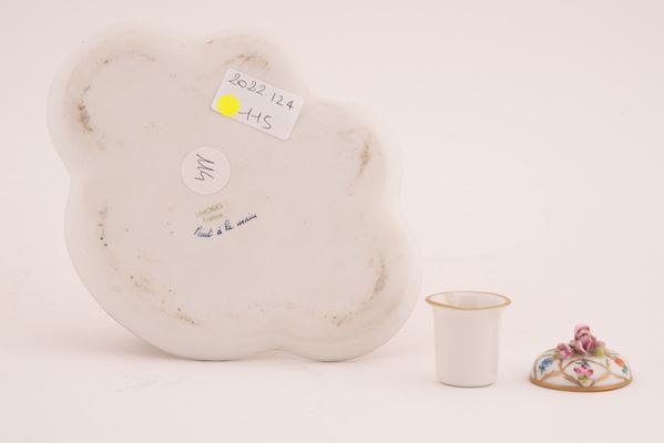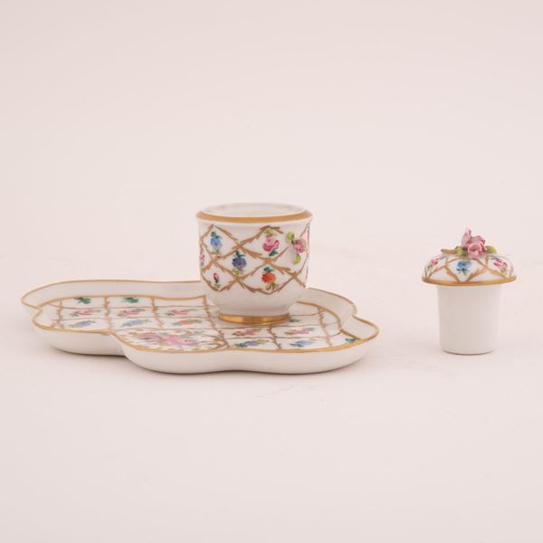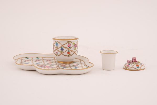 Calamaio a fondo bianco decorato in policromia con motivi vegetali, romboidali in giallo oro contenenti mazzetti di fiori. Coperchio con presa [..]
