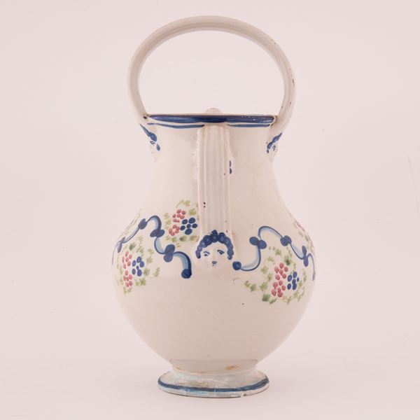 Brocchetta in maiolica decorata con fiori ed elementi stilizzati.