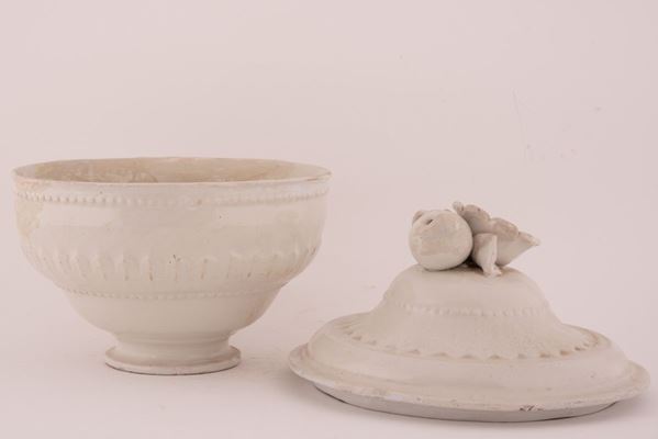Zuppiera in maiolica con decori naturalistici a rilievo (pomo a melograno)