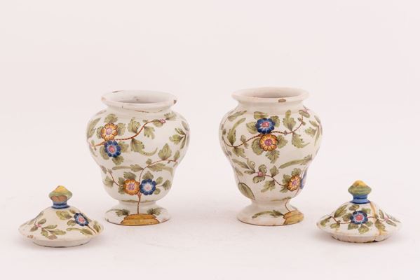 Coppia di potiches in maiolica a fondo bianco, decorati in policromia con tipico motivo a "tacchiolo"