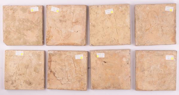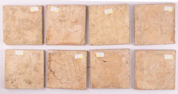 Otto riggiole decorate con elementi a graticcio e riserve in finto marmo.