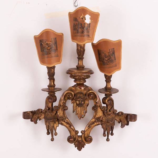 Applique in legno dorato e intagliato a motivi vegetali a tre luci