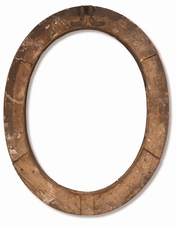 Cornice ovale in legno intagliata e decorata con motivi ad intreccio a rilievo.