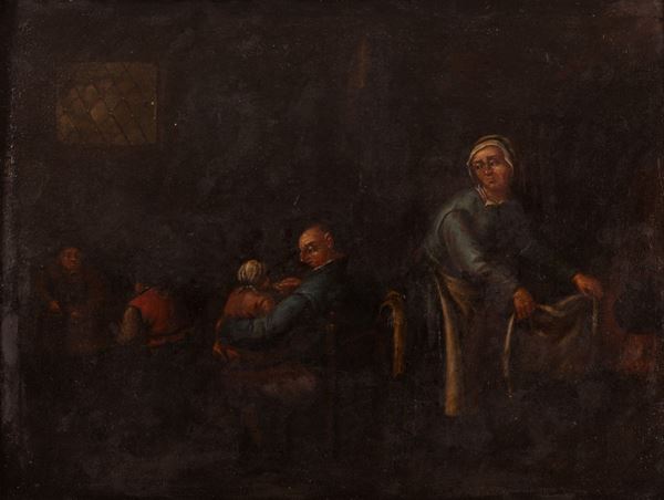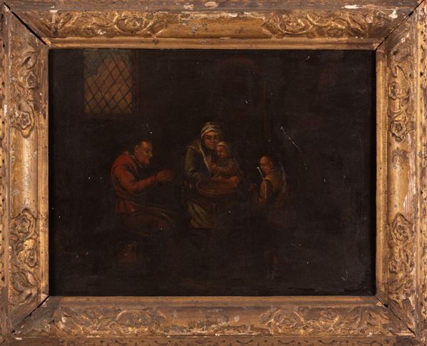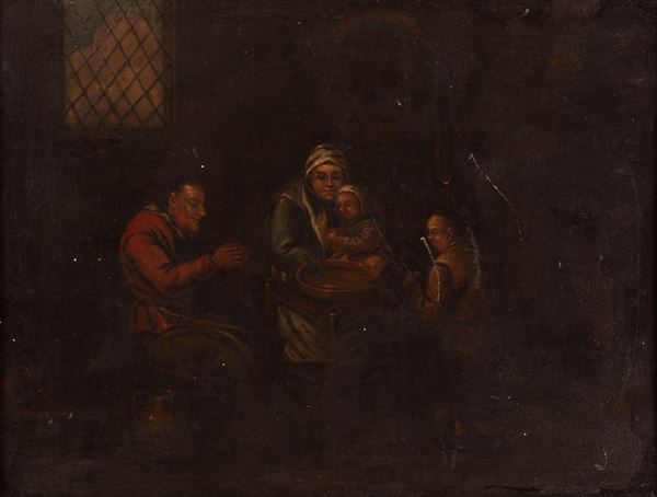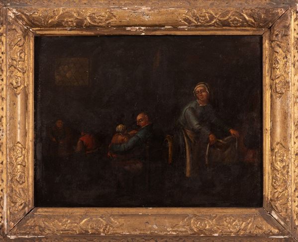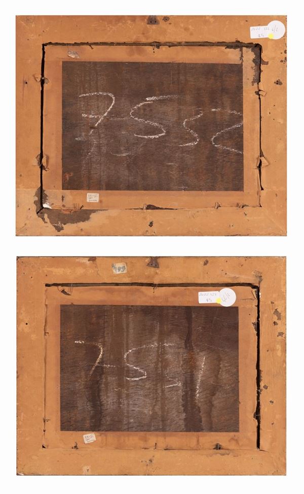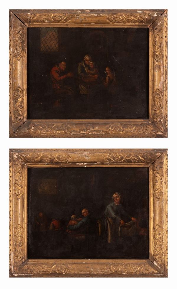Due dipinti raffiguranti scene di interno di cucina con figure