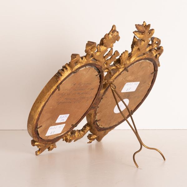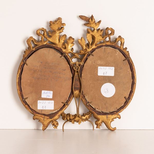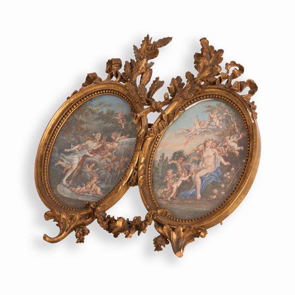 Coppia di acquerelli da François Boucher in cornice intagliata e dorata: Venere e Apollo; Venere con amorini