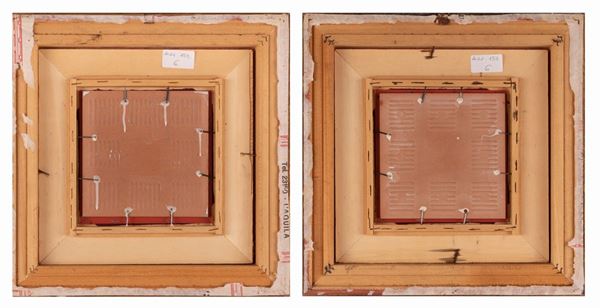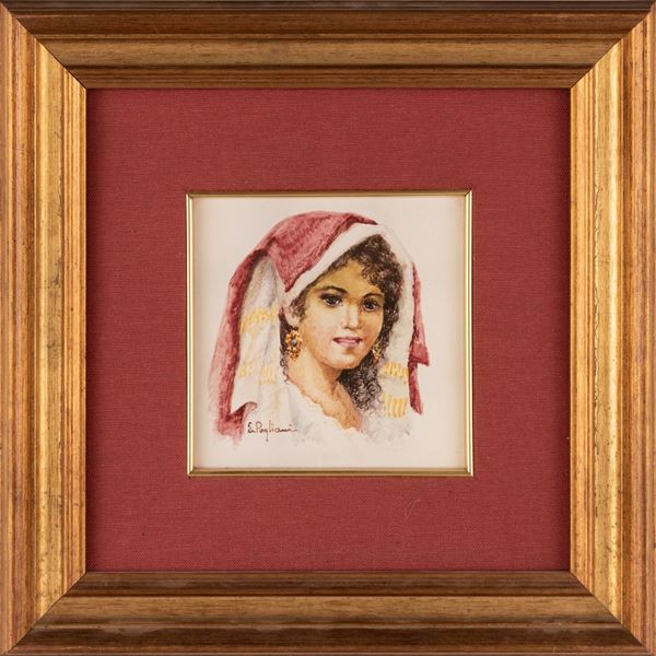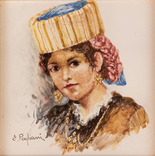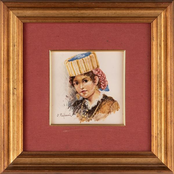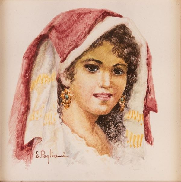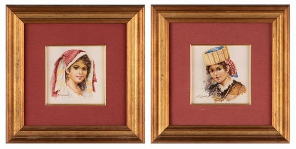 Coppia di mattonelle dipinte raffiguranti popolani in costume tradizionale