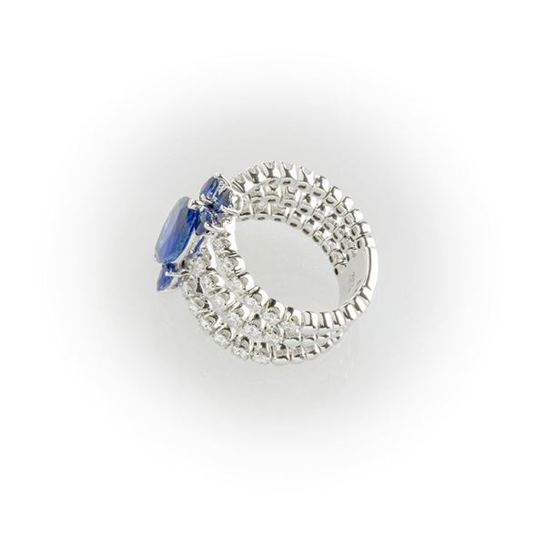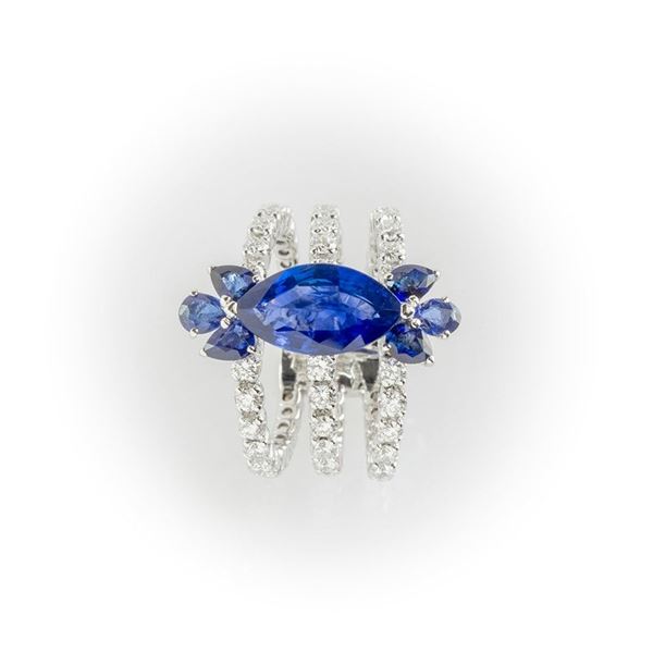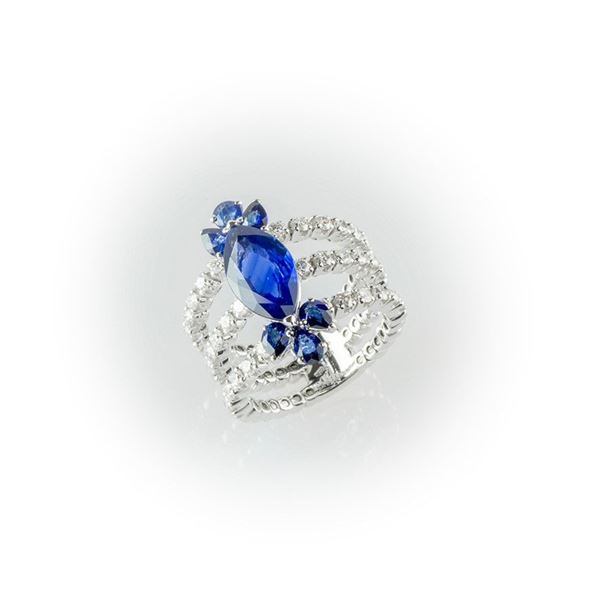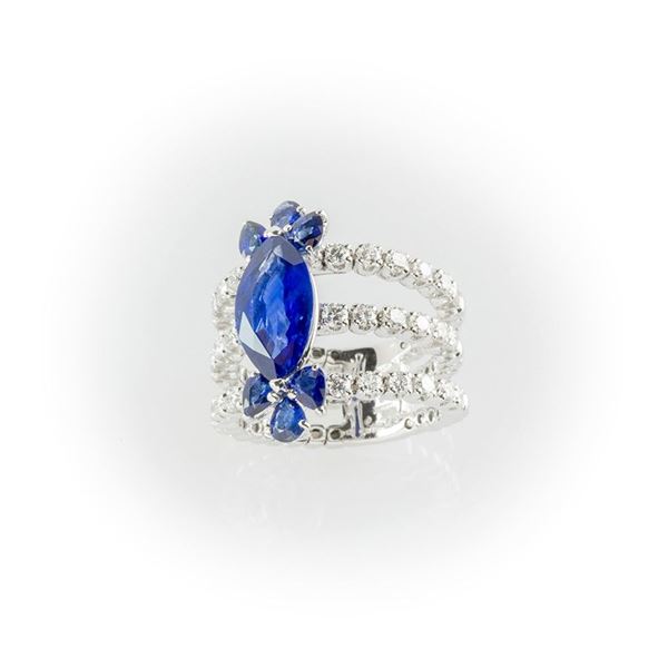 Anello a fascia in oro bianco con diamanti bianchi e zaffiri blu taglio a goccia e navette