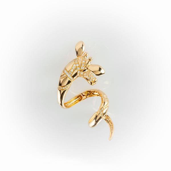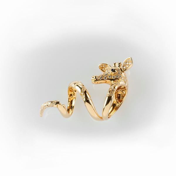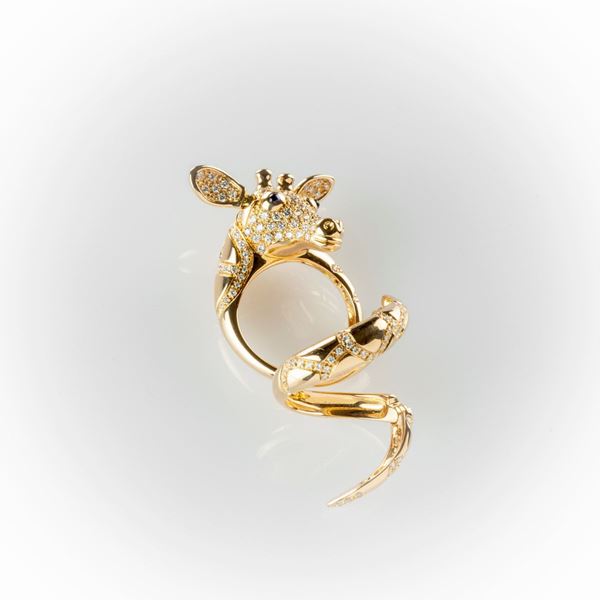 Anello giraffa Gismondi di particolare manifattura realizzato in oro rosa con diamanti bianchi taglio brillante e zaffiri taglio cabochon