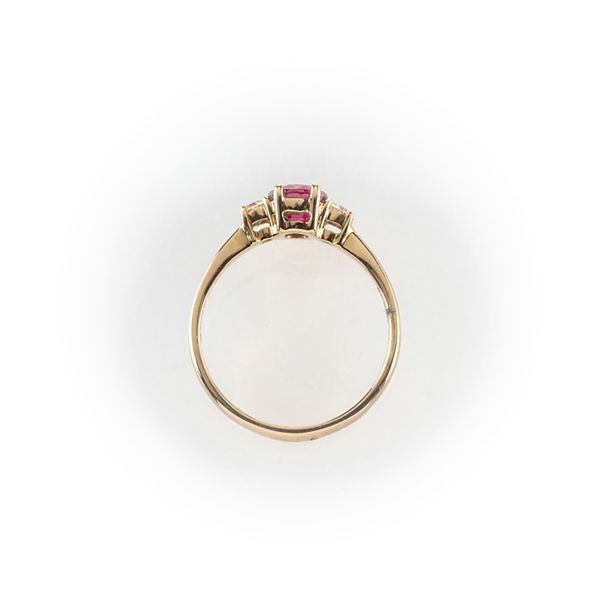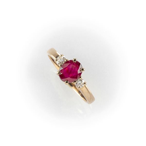 Anello Gismondi in oro rosa con rubino centrale taglio ovale contornato da due diamanti taglio brillante sul gambo