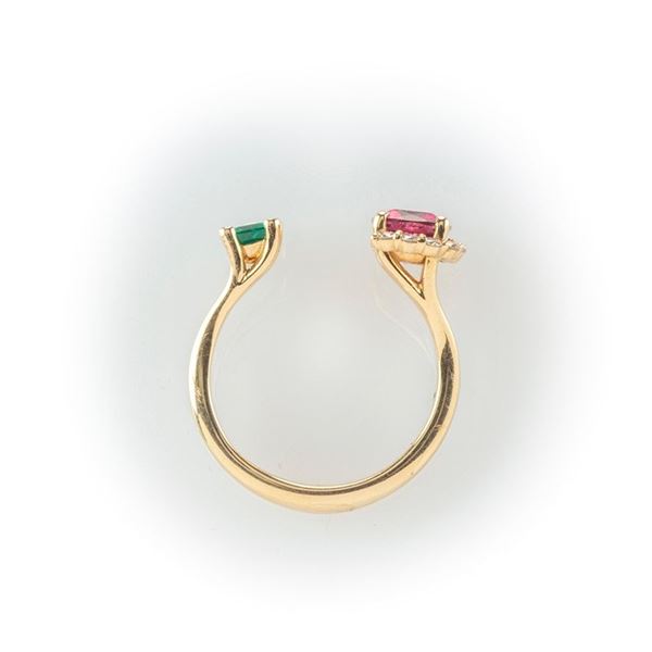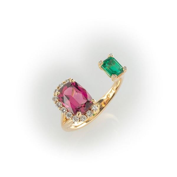 Anello Gismondi in oro rosa con smeraldo taglio quadrato, tormalina rosa taglio ovale e diamanti bianchi taglio brillante