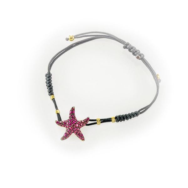 Bracciale in cordino nero con stella marina impreziosita da pavè di rubini. Quattro inserti in oro giallo e diamanti taglio brillante sul cor [..]