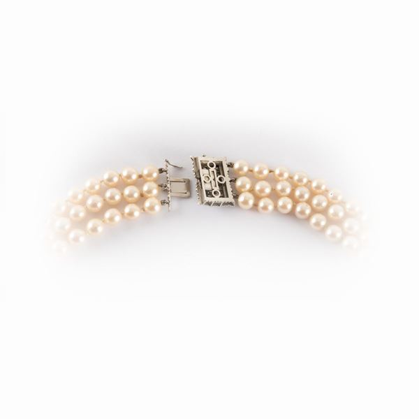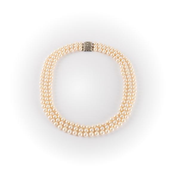 Collana in perle giapponesi a tre fili con chiusura in diamanti