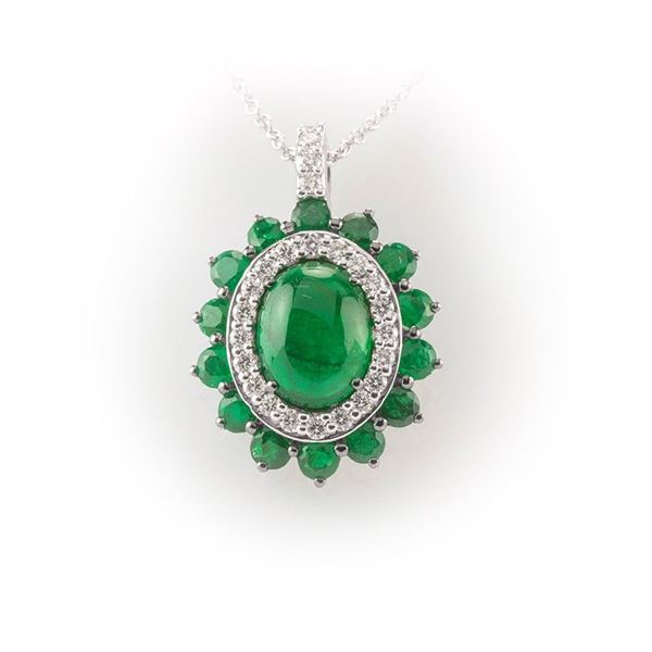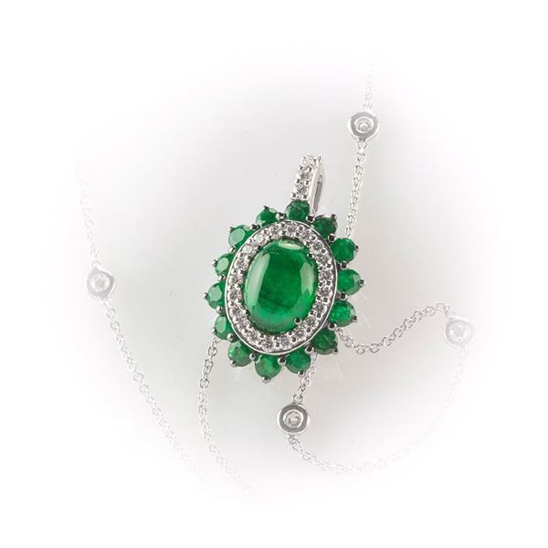 Girocollo in oro bianco con cabochon di smeraldi, diamanti bianchi taglio brillante e contorno di smeraldi taglio rotondo. Sottile catenina [..]