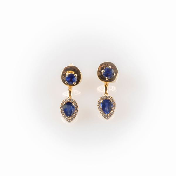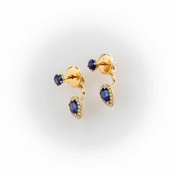 Orecchini in oro rosa realizzati con particolare composizione di diamanti taglio brillante e zaffiri blu taglio rotondo e taglio a goccia.