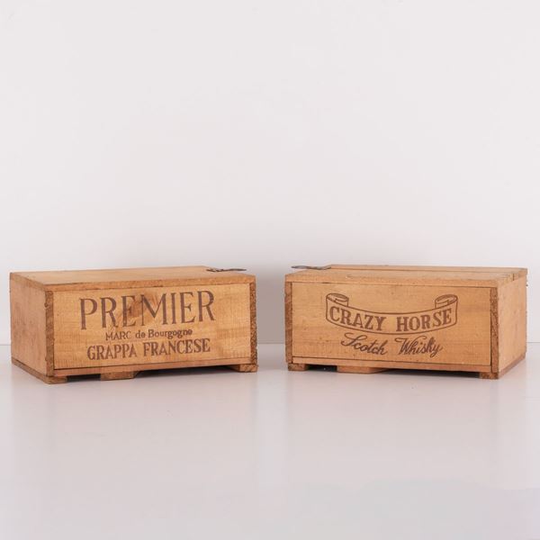 Due confezioni originali contenenti ciascuno 1 bt. di Crazy Horse Scotch Whisky e 1 bt. di Marc de Bourgogne France Premier Nuits Sp. Georges.