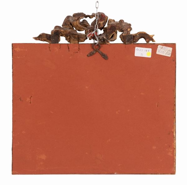 In cornice dorata con tre ordini di modanature e con cimasa a festone intrecciato a fiocco (piccolo restauro al retro)