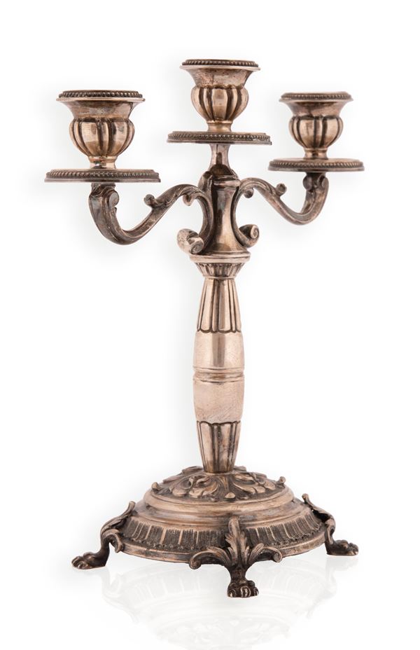 Candelabro in argento a tre luci cesellato con volute vegetali