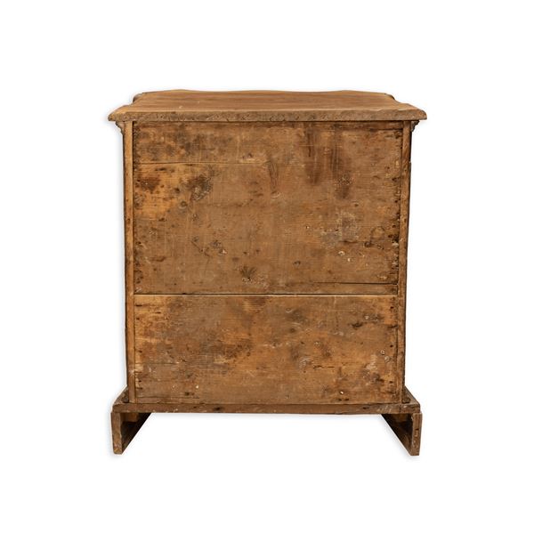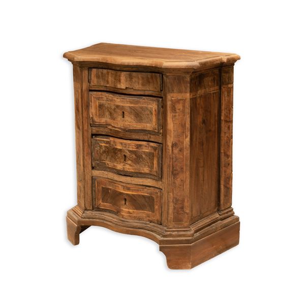 Comodino mosso sul fronte con 4 cassetti in radica, legno di frutto.