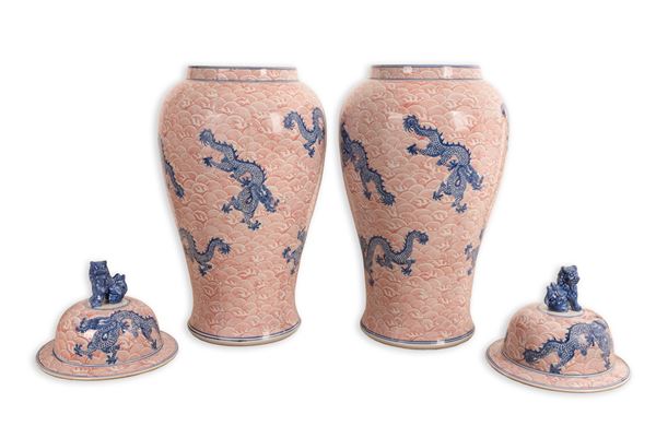 altezza con coperchio cm 110Grandi vasi cinesi con decoro a draghi Tianqiuping di color blu che nuotano tra le onde rosse stilizzate e rappresentanti un oceano.