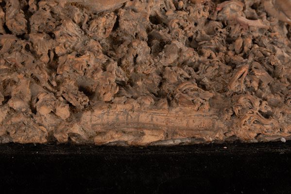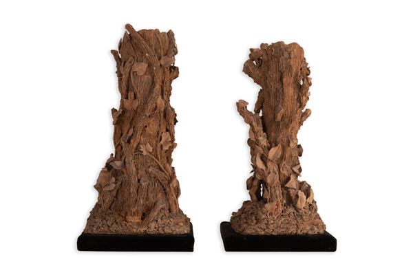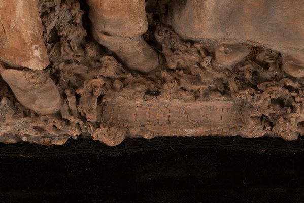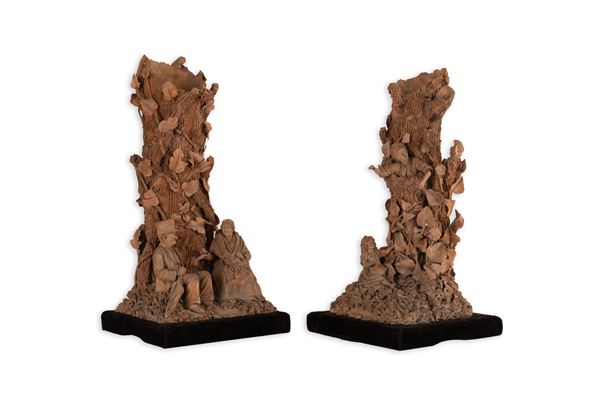 Coppia di sculture in terracotta intitolate "Prima Età" e "Ultima Età"