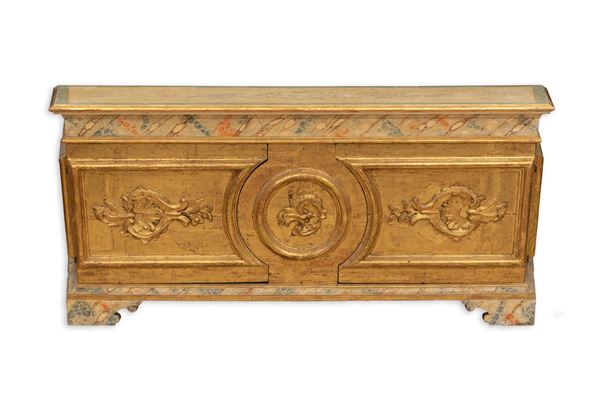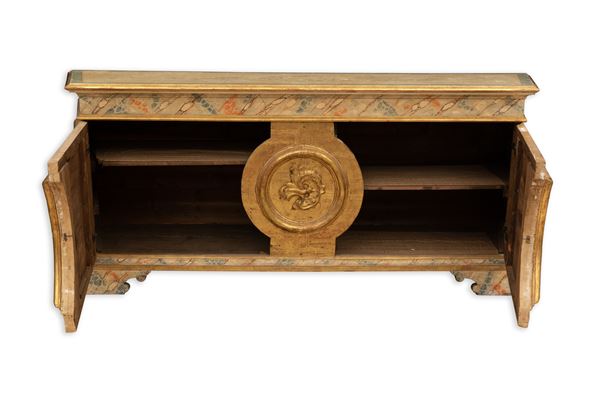Credenza a due ante in legno intagliato, dorato e decorato a finto marmo, Centro Italia, XIX secolo
