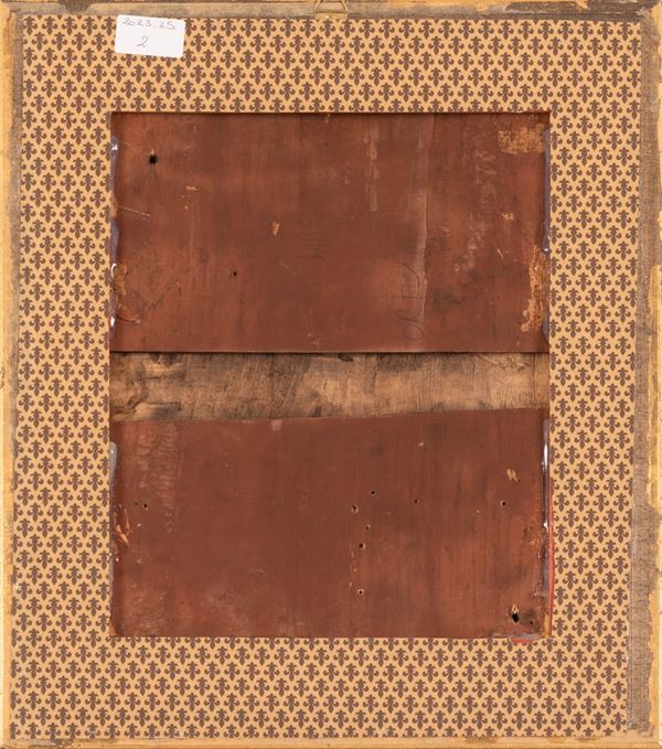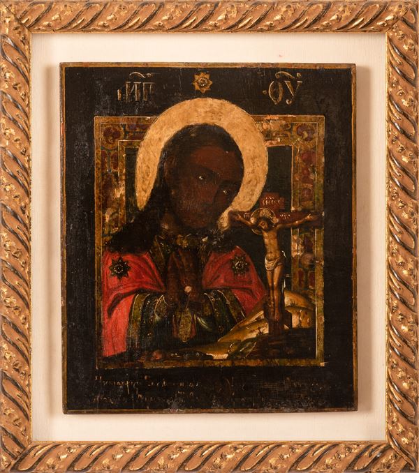 cm 31x26; con cornice cm 43x27La Vergine orante veste un ricco mantello in porpora proprio dell'Imperatrice di Bisanzio sul quale sono cucite due stelle ad otto punte, mentre una brilla sopra la sua testa. Esse rappresentano simbolicamente la verginità della Madre di Dio , prima, durante e dopo la nascita del Figlio. Una ricca cornice policroma dipinta incornicia la figura della Madre di Dio e di Gesù Crocifisso.