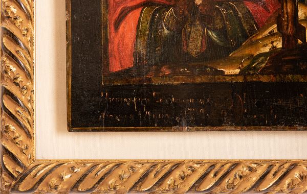 L'icona è stata montata in una nuova cornice a cassetta dorata con fondo telato bianco.