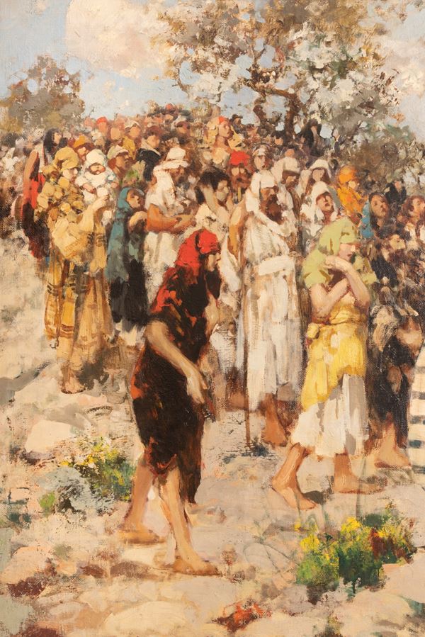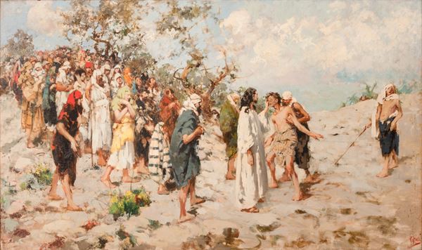Si veda per confronto l'acquerello "Il cieco di Gerico" (Provenienza Collezione Di Domenico, Napoli) di grande formato (cm 70x94) quale modello o derivazione dell'olio proposto in catalogo.