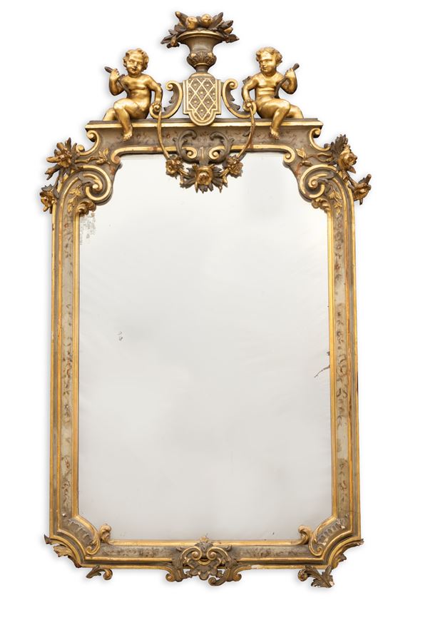 Specchiera: riccamente intagliata e dorata con decori floreali. Sormontata da un blasone con vaso di fiori affiancato da due putti reggifestone. Difetti e mancanze nella parte inferiore dello specchio.