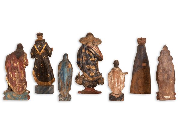 Lotto di 7 statuine in legno policromo con soggetti e misure diverse, Portogallo, XVI/XVII secolo