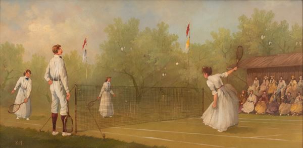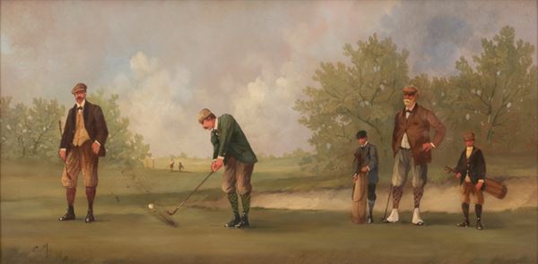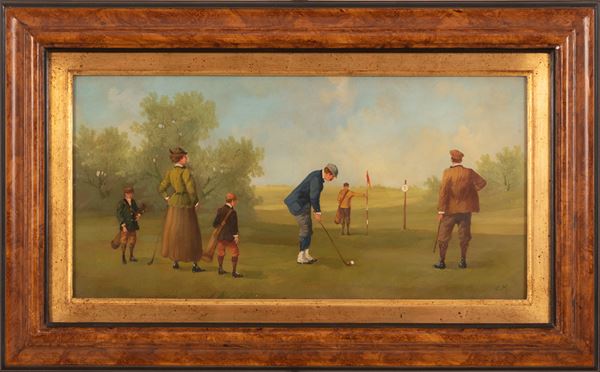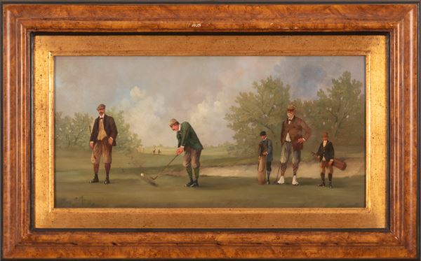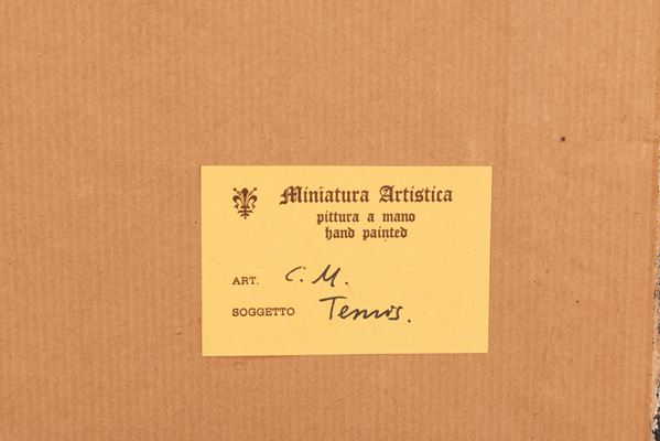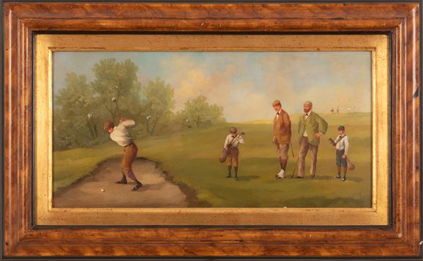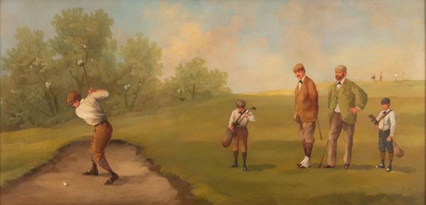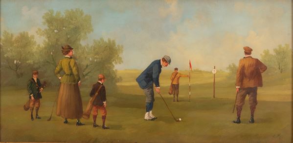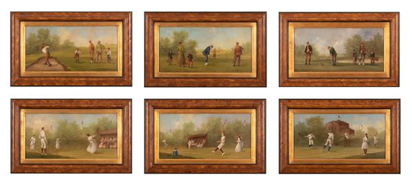 Lotto di sei dipinti giocatori di golf e di tennis firmati in basso "C.M."
