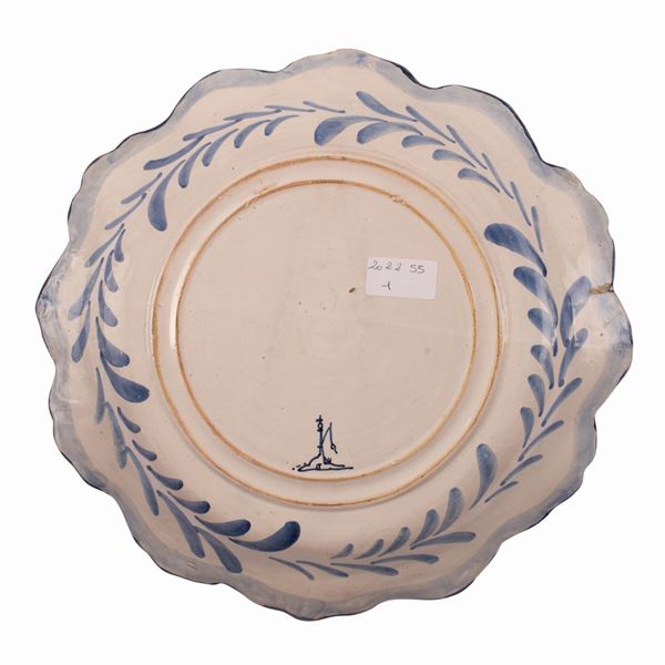 Ø cm 33,5Grande piatto Savona in porcellana sagomata dipinta bianca e blu, raffigurante un fauno, un uomo con elmo piumato e una donna; due angeli ai lati