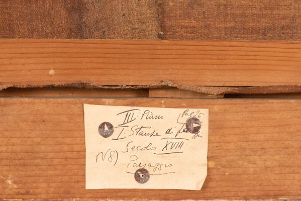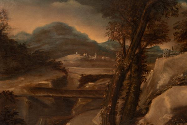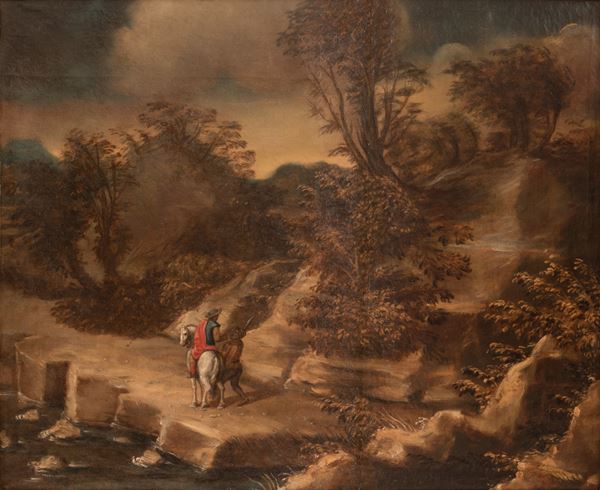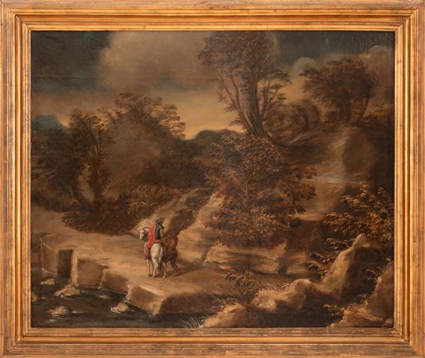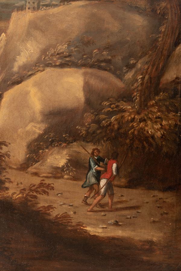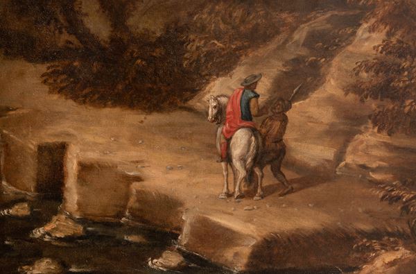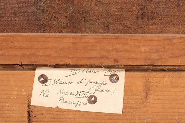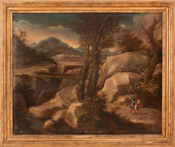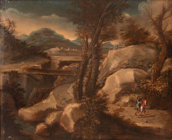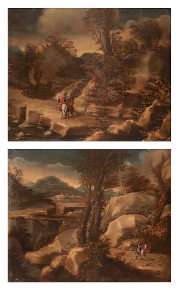 Coppia di dipinti raffiguranti paesaggi con personaggi