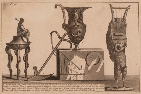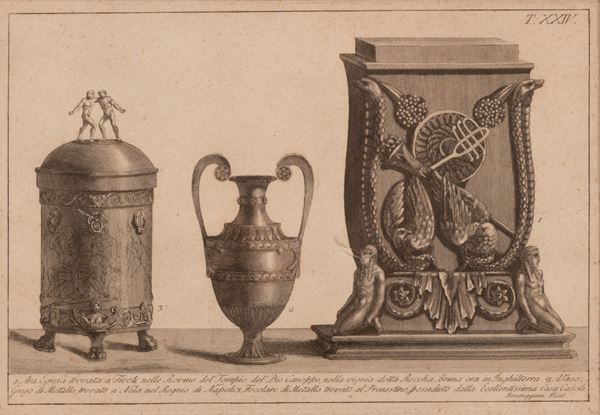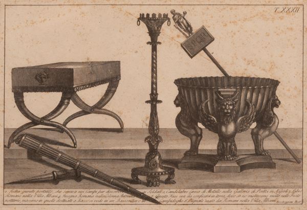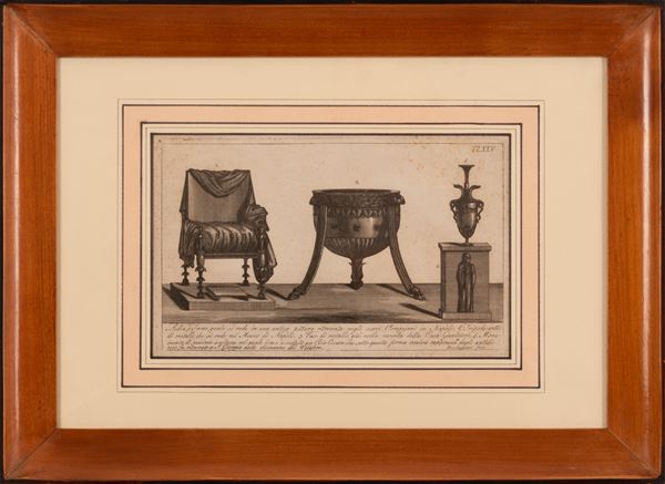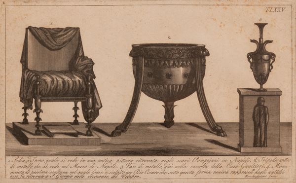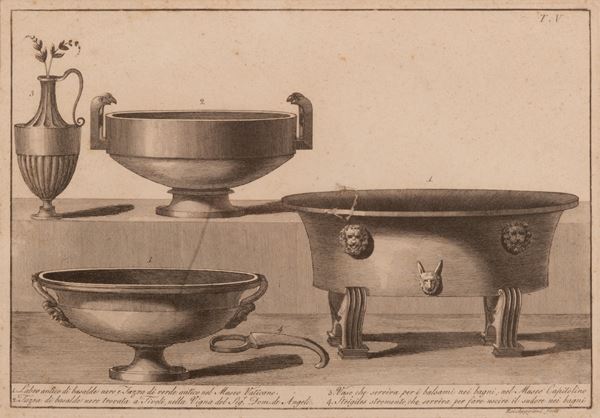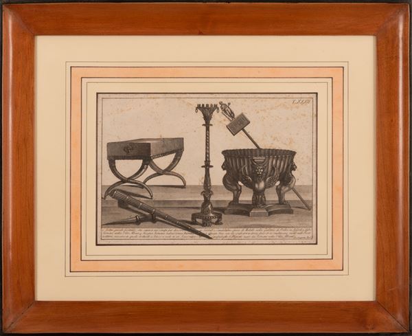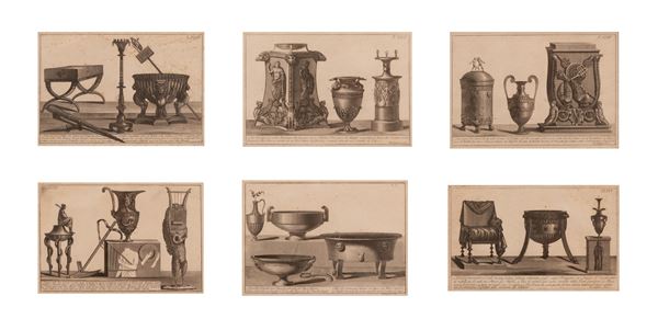 Lotto di 6 incisioni illustranti suppellettili, arredi e costumi descritti da un vasto e vario repertorio di antichità di eterogenea provenienza [..]