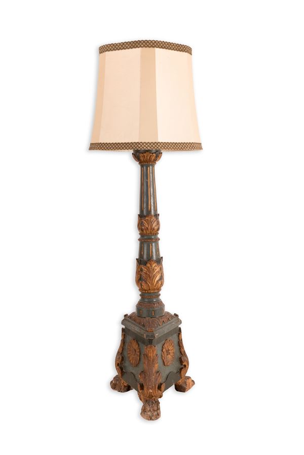 Torcere da terra in legno intagliato dorato e laccato adattato a lampada