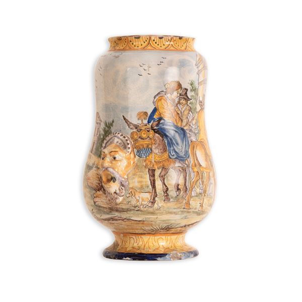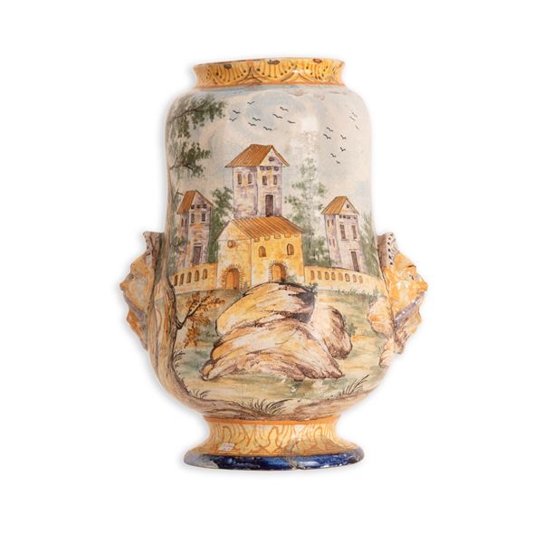 altezza cm 41Vaso in maiolica istoriato da un lato con contadina su mulo e butteri a cavallo e dall'altro con cinta di mura e case. Ai lati due mascheroni policromi.