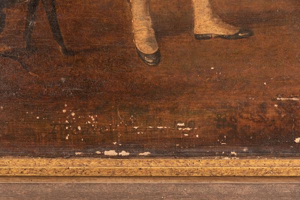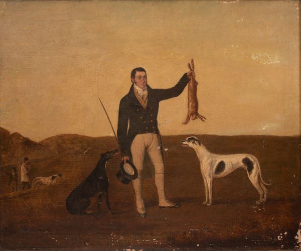 cm 64x76 con cornice 78x90Un gentiluomo alza al cielo una lepre. Ai suoi fianchi un levriero nero e uno bianco pezzato. Sullo sfondo altri cacciatori con cani