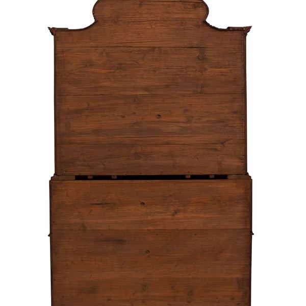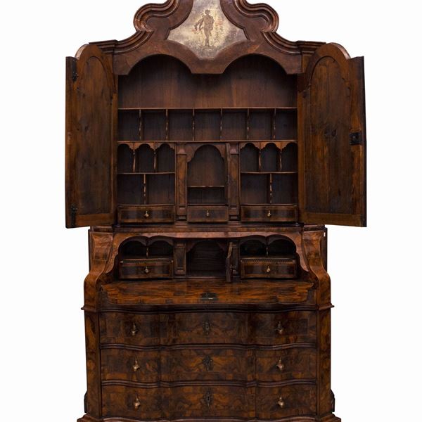 Fronte a tre cassetti sormontato da calatoia mistilinea a ribalta celante diversi tiretti, cassetti e vani sagomati. Sportelletto interno centrale tra due lesene.