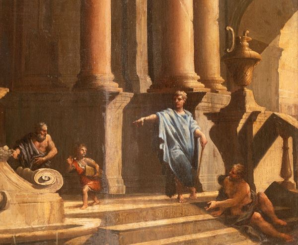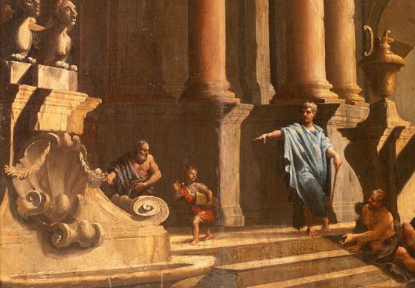 Filosofi sulla scalinata di un tempio indicano una fontana