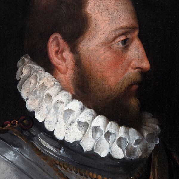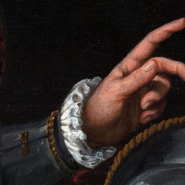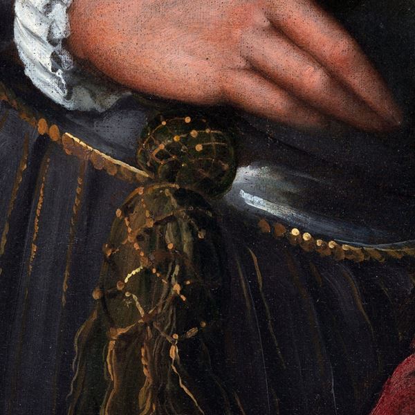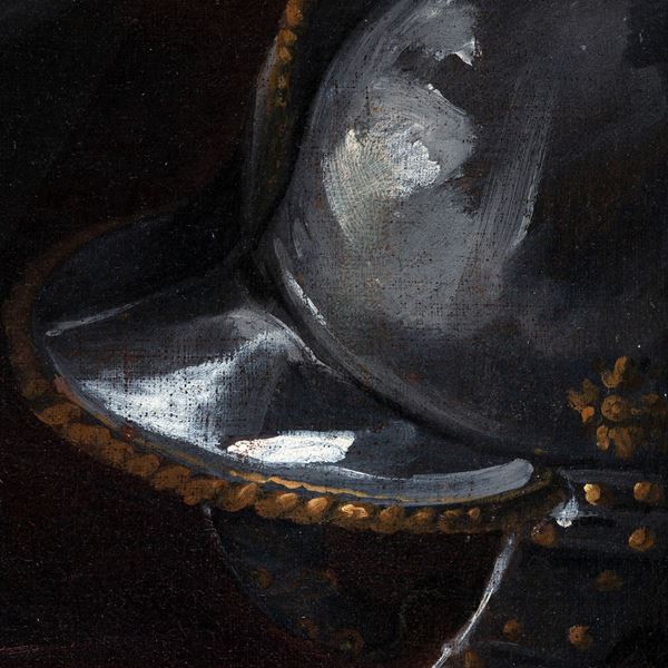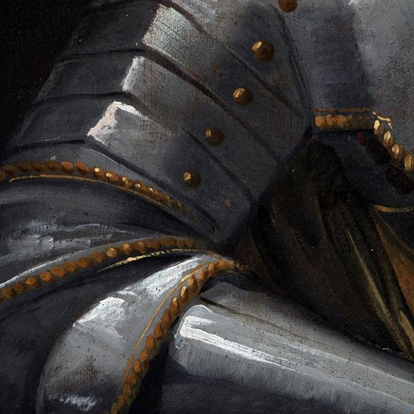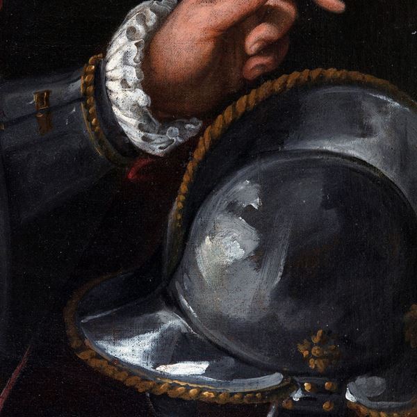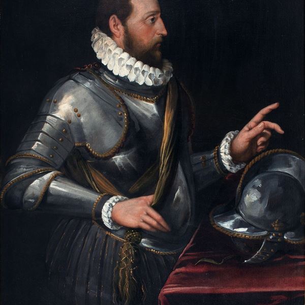 Ella continua scrivendo che "L’uomo in arme è effigiato seguendo lo schema del ritratto aulico, diventato consueto nella seconda metà del Cinquecento: il taglio inquadra la figura ben al di sotto del busto, accanto a un tavolo coperto di velluto rosso su cui è appoggiato l’elmo. Il personaggio è effigiato di profilo a grandezza naturale in un gesto retorico dal significato preciso e codificato nella pittura del secondo Cinquecento, quasi a ricordare l’esordio di un discorso, un appello all’attenzione che implica di per sé la presenza di un interlocutore."