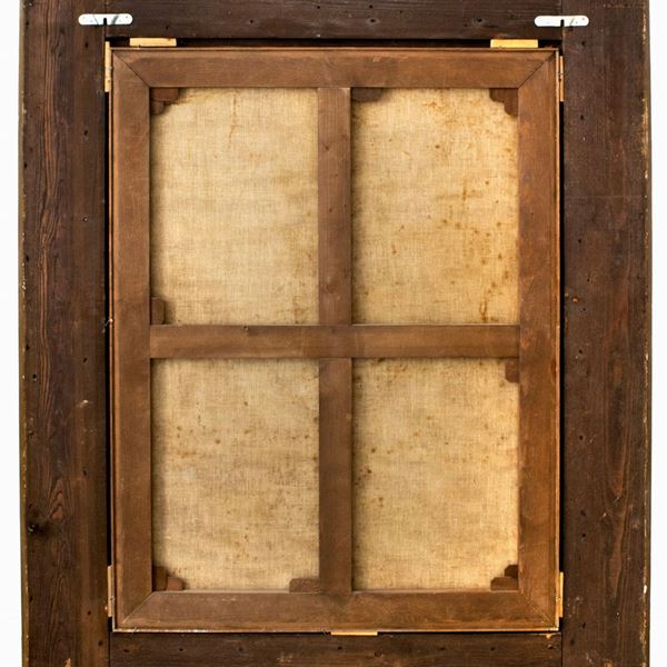 Importante cornice di gusto cinquecentesco in legno intagliato e dorato, con ampia fascia centrale decorata da elementi conformati a guisa di scudo antico racchiusi internamente da una bordura costituita da foglie d'acanto ed esternamente, con elementi a dentelli sagomati in rilievo.