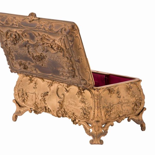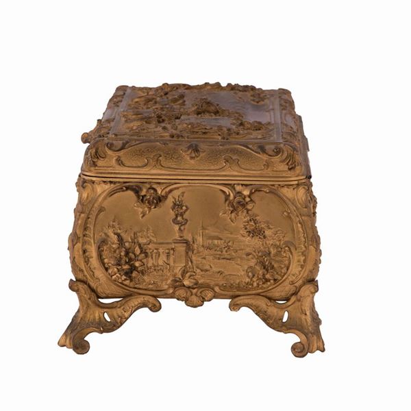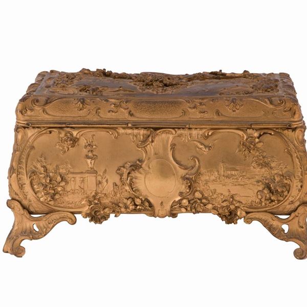 Scatola portagioie in metallo dorato Napoleone III finemente cesellato con motivi floreali e paesaggi
