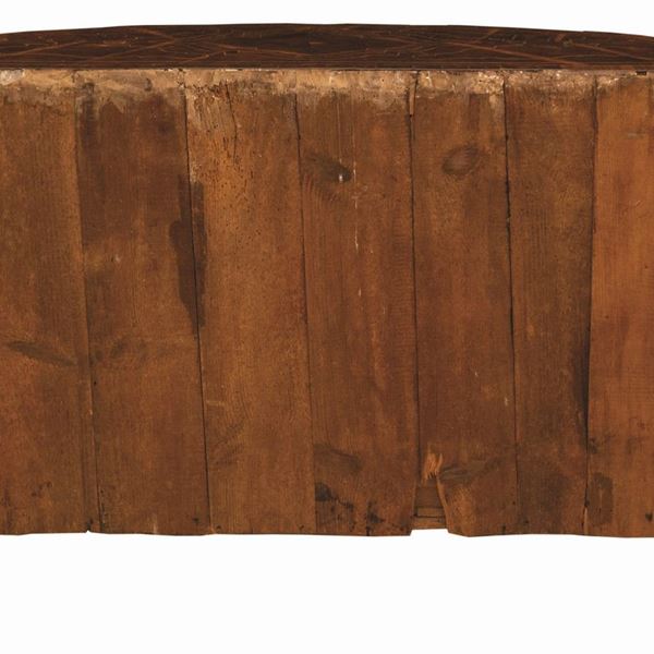 cm 100x155x63Lastronato in varie essenze (ulivo, carrubo e acero) con intarsi decorativi al piano.
