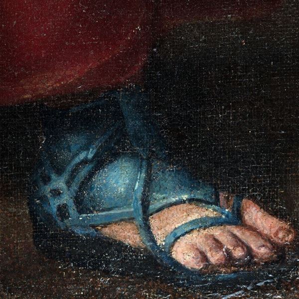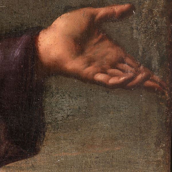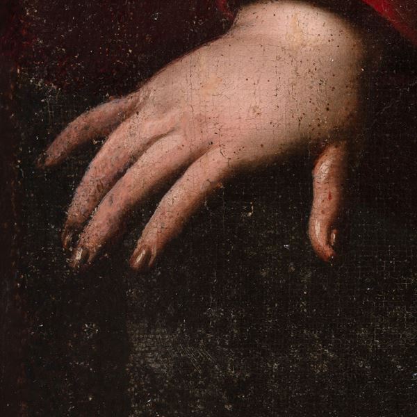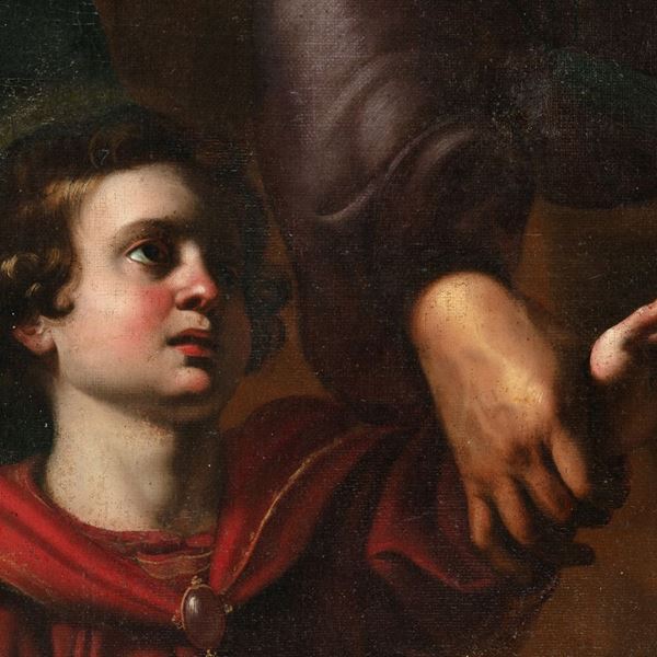 cm 187x136Accompagnato da expertise del prof. Pierluigi Carifano, che confronta l'opera proposta in catalogo con il capolavoro già nella chiesa romana di Sant'Agostino. L'esperto sottolinea come il realismo della composizione "[...] è un bell'esempio dell'adesione di Gramatica al naturalismo di matrice caravaggesca, verisimilmente da ricondurre ad uno studio dal vero mentre il Bambino dal volto paffuto e dall'acconciatura dei capelli classica, trdisce la giovanile propensione dell'artista per l'arte di Raffaello [...]" (Siena, 30 marzo 2008)