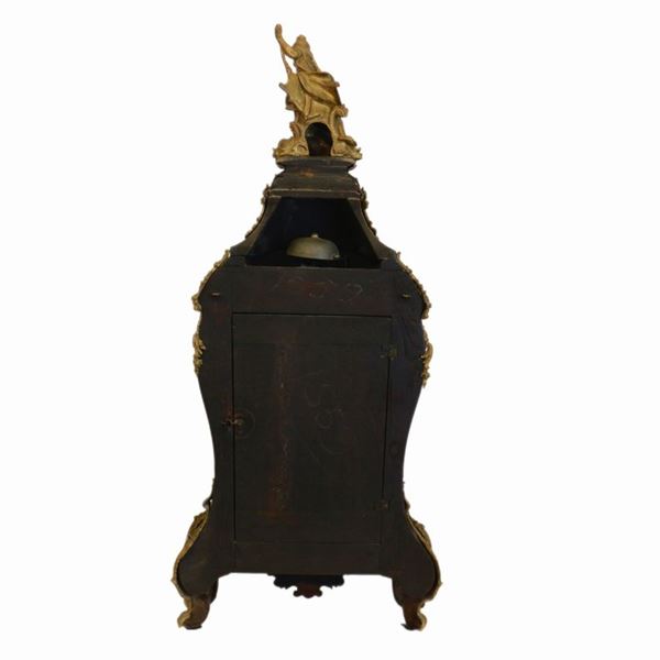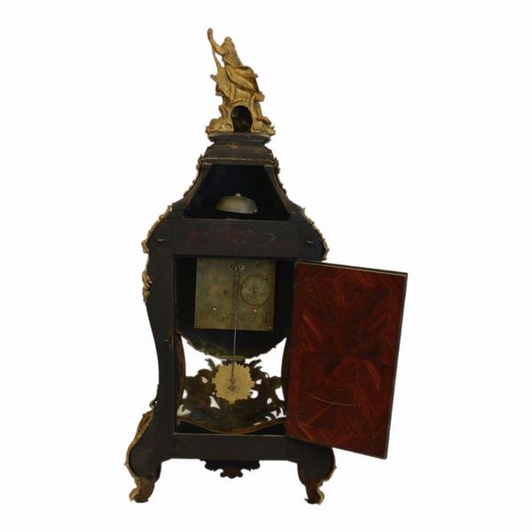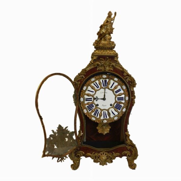 Cassa sagomata lastronata in palissandro e decorata da fregi in bronzo dorato, poggiante su quattro piedi a voluta. Quadrante in smalto bianco con numerazione romana in blu per le ore e araba per i minuti.  Sul quadrante scritta in smalto blu "Collier Paris".
