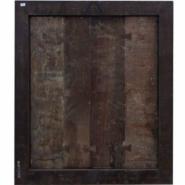 cm 120x105,5; con cornice cm 144x129Per l'iconografia mariana si confronti l'effigie sul portale della chiesa della nazione spagnola a Roma, in via di Monserrato, dove, come nel quadro esaminato, il Bambin Gesù è intento a tagliare una roccia con una sega da falegname