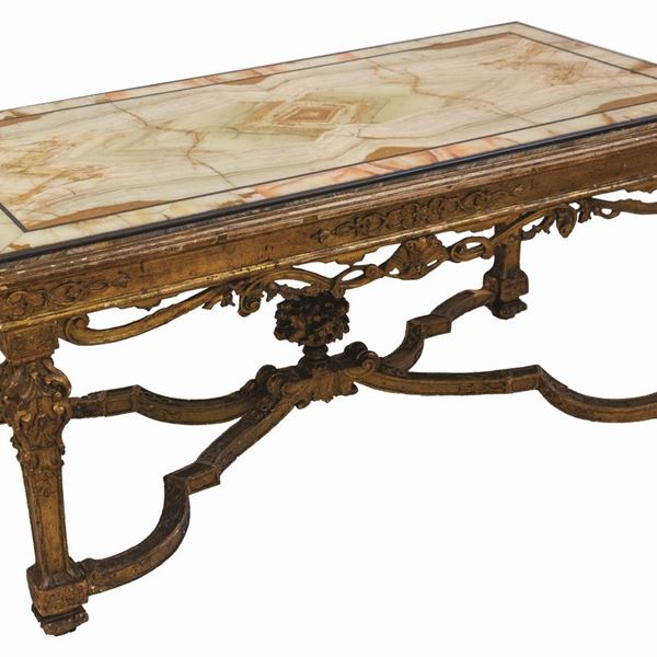 Tavolino basso in stile Luigi XIV con piano lastronato in onice. Roma, XX secolo